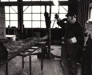 In that year Waddington sold the sculpture that I had brought with me from Ireland and I used that money to buy a welding torch and regulators, and I began to weld in our suburban garage in Oakville. The first of the life-sized figures was John McMenemy’s “Lazarus” which is made from packing case strapping. At that time, while we still lived in Oakville, I used to take walks along the Canadian National railway tracks towards Bronte. It was a stretch of track used by freight trains bringing scrap to the steel mills in Hamilton. One day I came across part of a coil of steel strapping lying by the side of the tracks. The extended coil lying in the weeds suggested the description of the grave clothes found by the disciples in the tomb after the Resurrection. I brought the strapping home and it is part of that Lazarus sculpture. The unravelled coil evokes the Resurrection just as the raising of Lazarus prefigures it. I like such pre-configurations or reverberations of feelings.