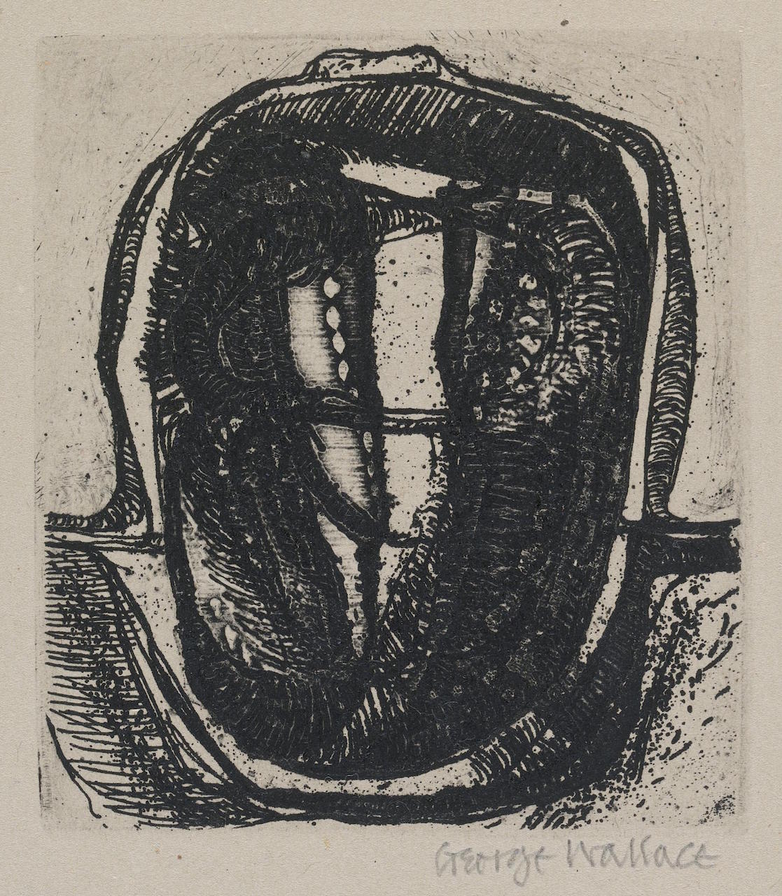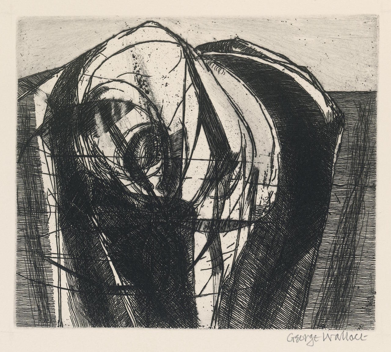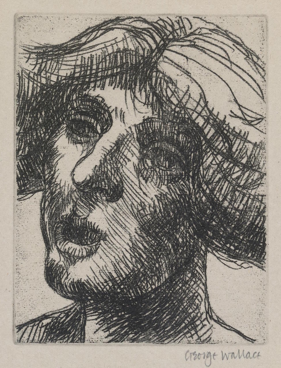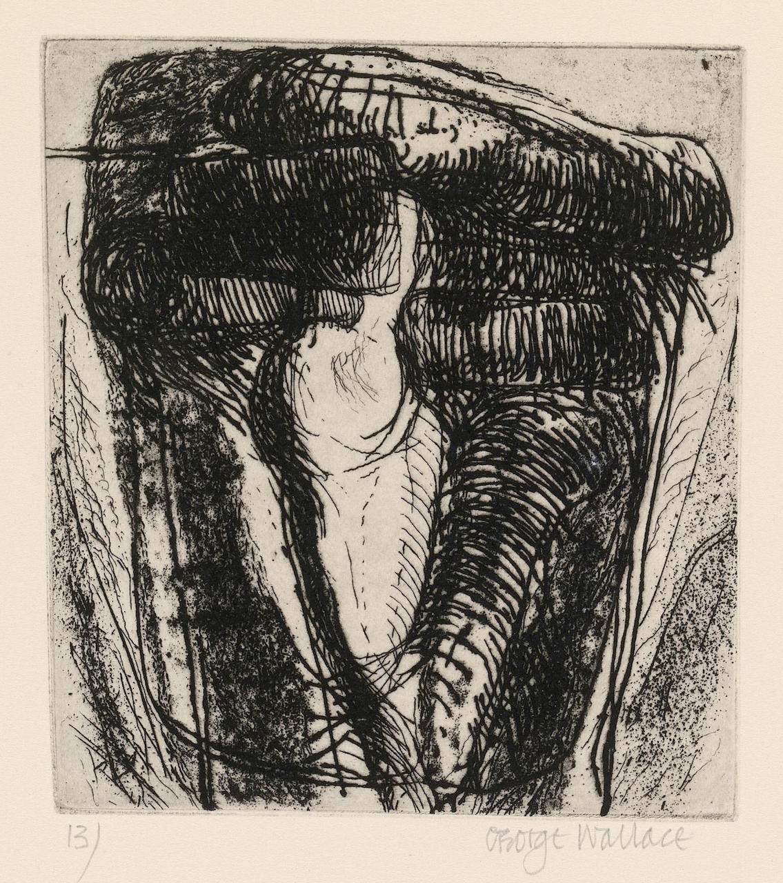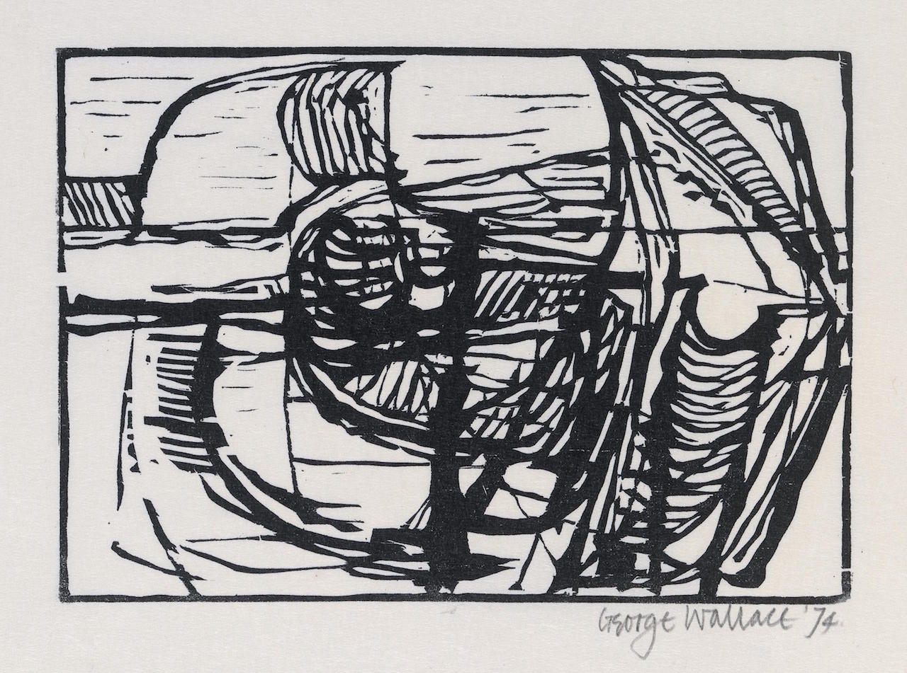 image ⓒ National Gallery of IrelandPit, date unknown, woodcut, 36 x 45 cm.#70 - Self Portrait, 1974, woodcut, 33.8 x 16.2 cm.#83 - Weeping Woman, 1983, woodcut, 30.8 x 27.8 cm.#83 - Weeping Woman, 1983, woodcut printed in redGeorge Wallace, Sculpture & Graphics Exhibition Poster - Hamilton Artist's Inc., 1983, woodcut