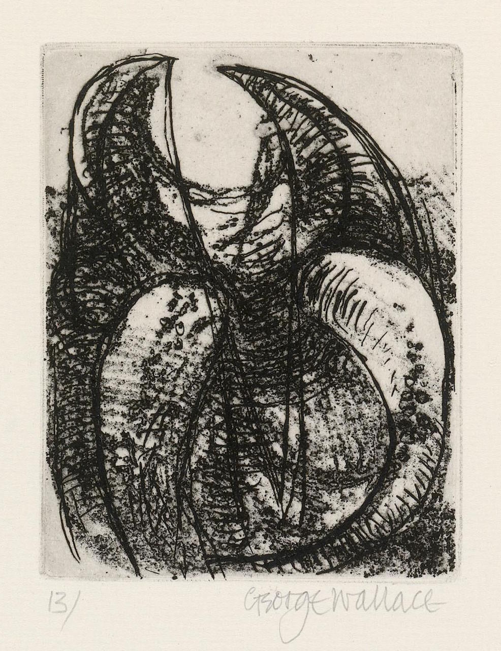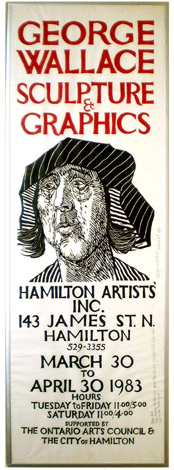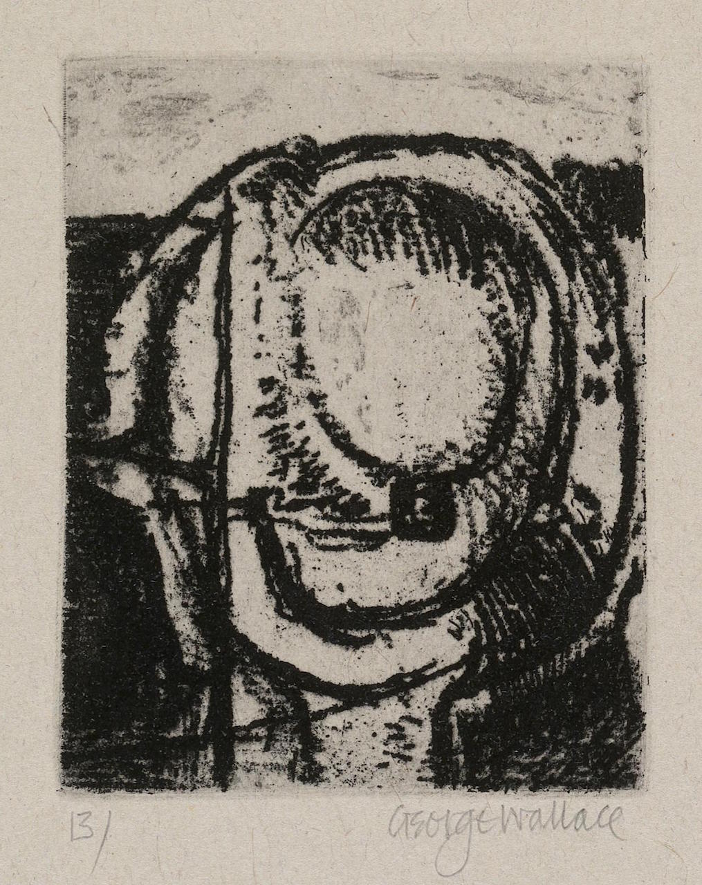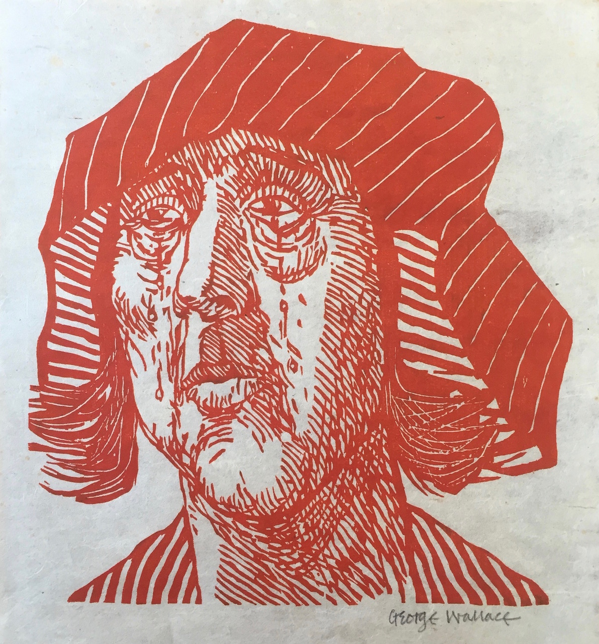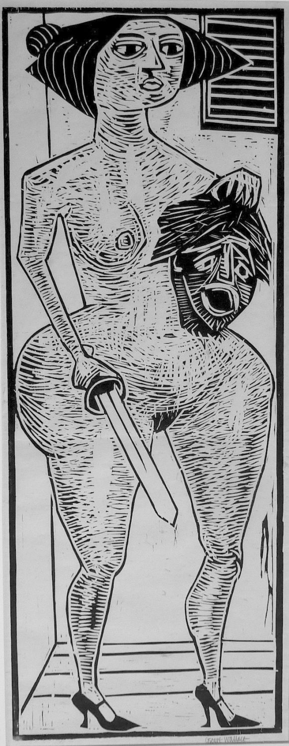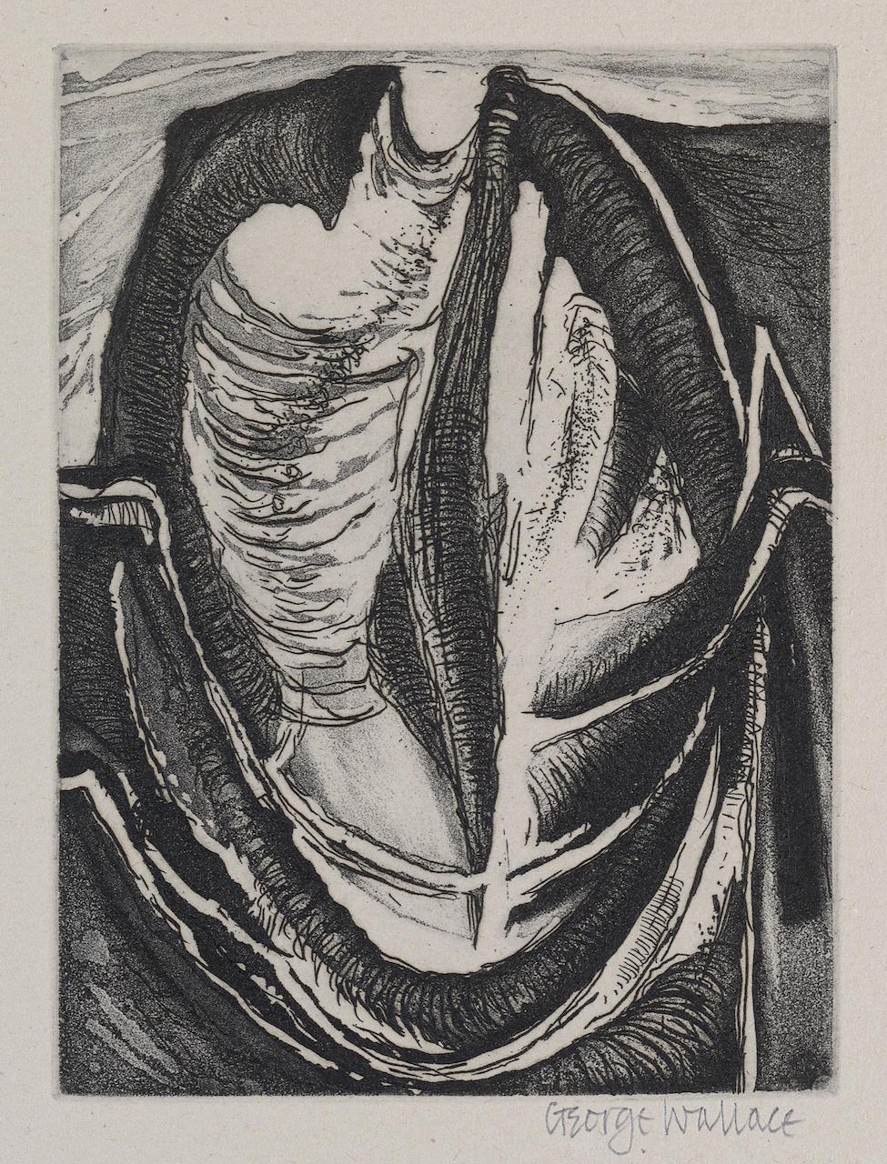 image ⓒ National Gallery of IrelandPit, date unknown, woodcut, 36 x 45 cm.#70 - Self Portrait, 1974, woodcut, 33.8 x 16.2 cm.#83 - Weeping Woman, 1983, woodcut, 30.8 x 27.8 cm.#83 - Weeping Woman, 1983, woodcut printed in redGeorge Wallace, Sculpture & Graphics Exhibition Poster - Hamilton Artist's Inc., 1983, woodcut