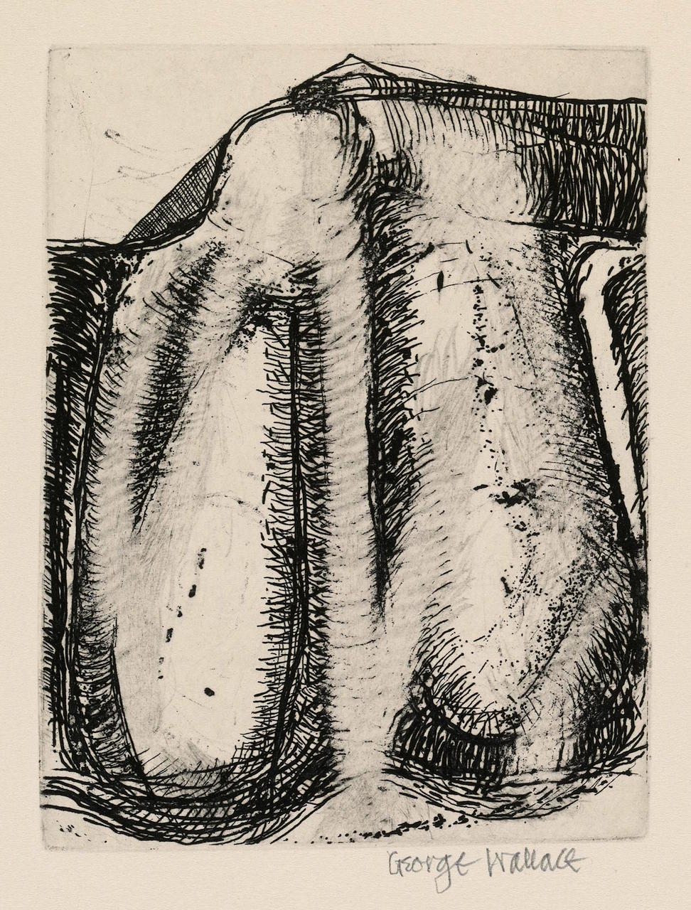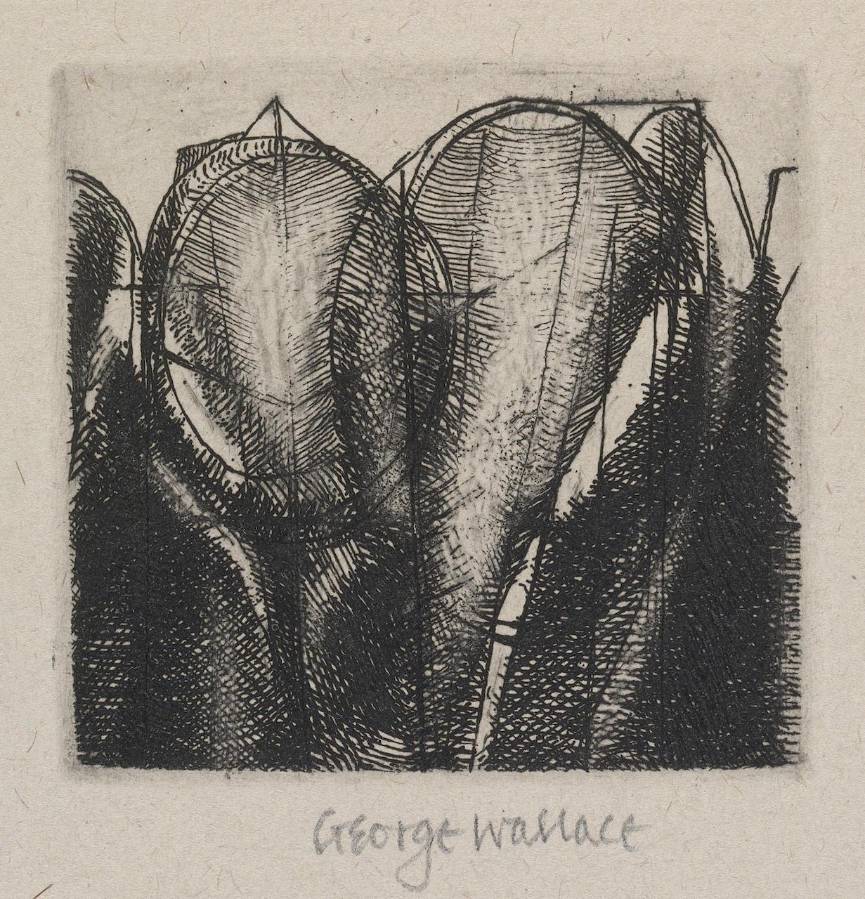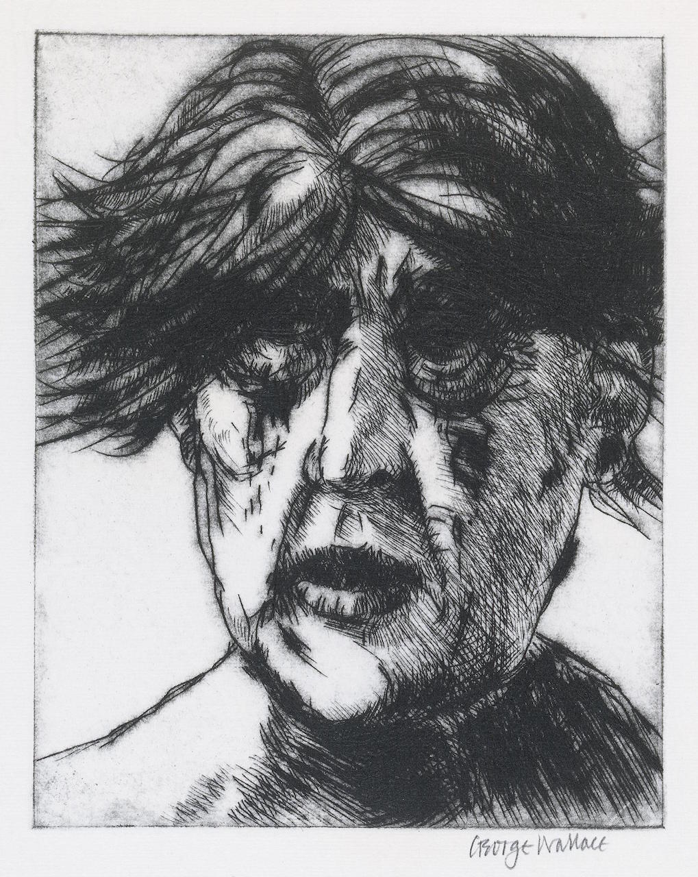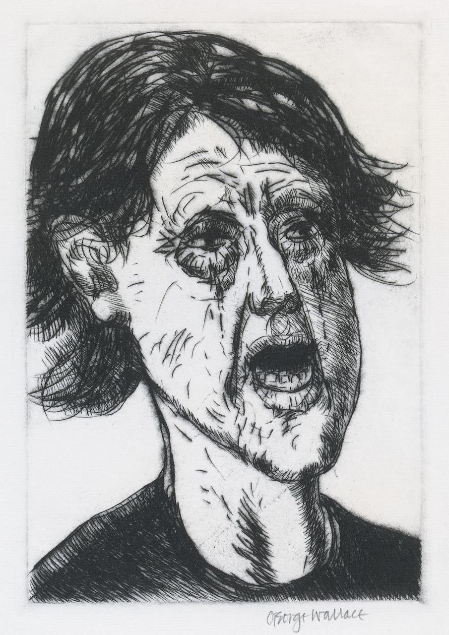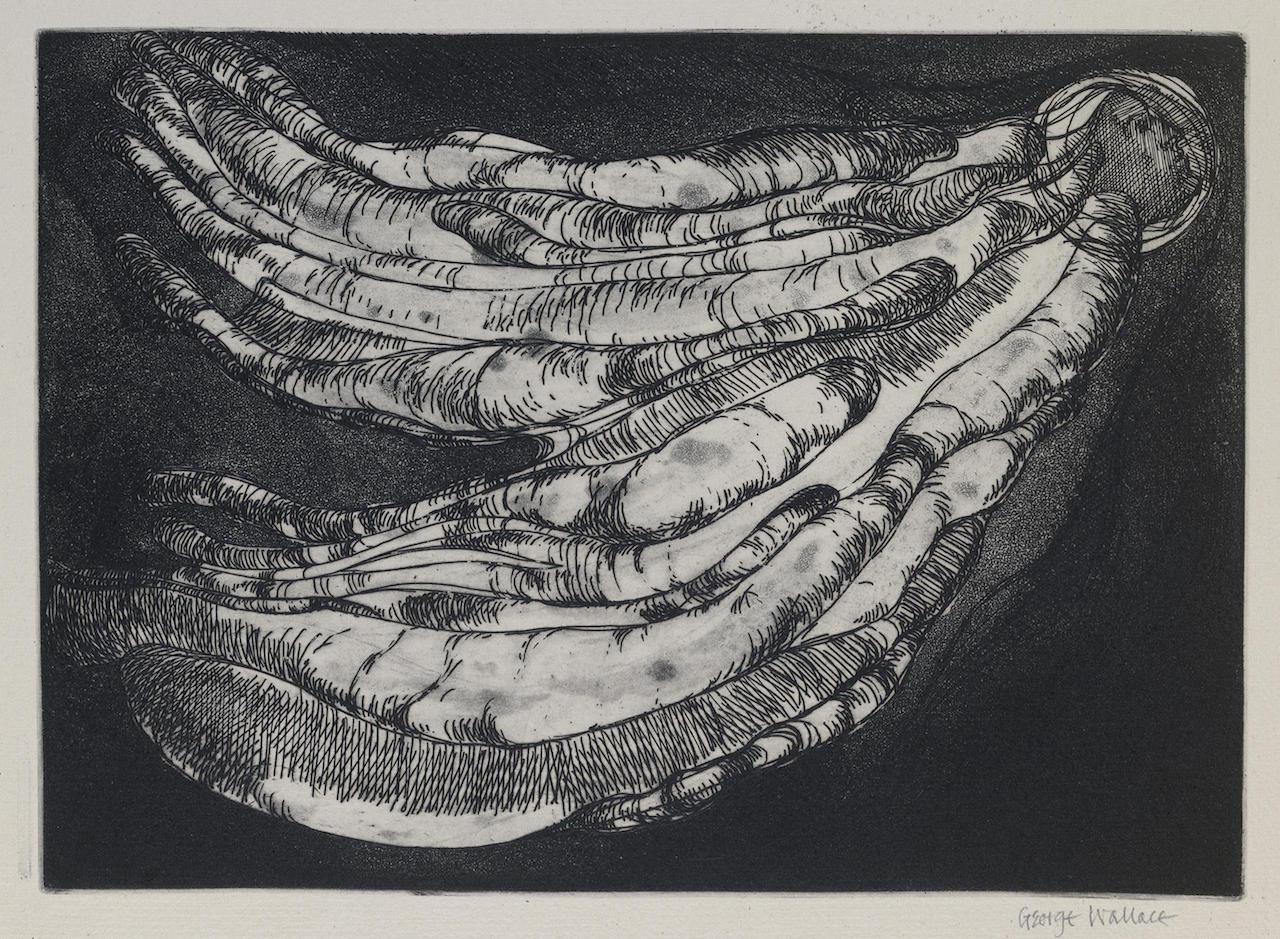 image ⓒ National Gallery of IrelandPit, date unknown, woodcut, 36 x 45 cm.#70 - Self Portrait, 1974, woodcut, 33.8 x 16.2 cm.#83 - Weeping Woman, 1983, woodcut, 30.8 x 27.8 cm.#83 - Weeping Woman, 1983, woodcut printed in redGeorge Wallace, Sculpture & Graphics Exhibition Poster - Hamilton Artist's Inc., 1983, woodcut
