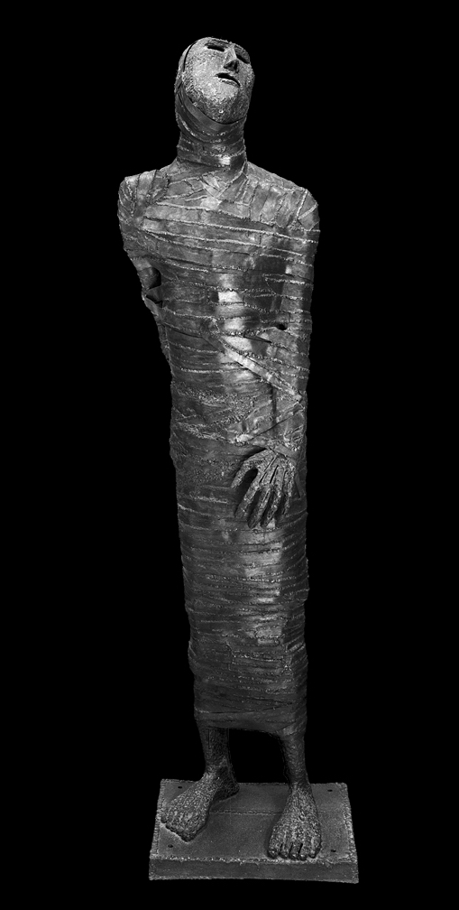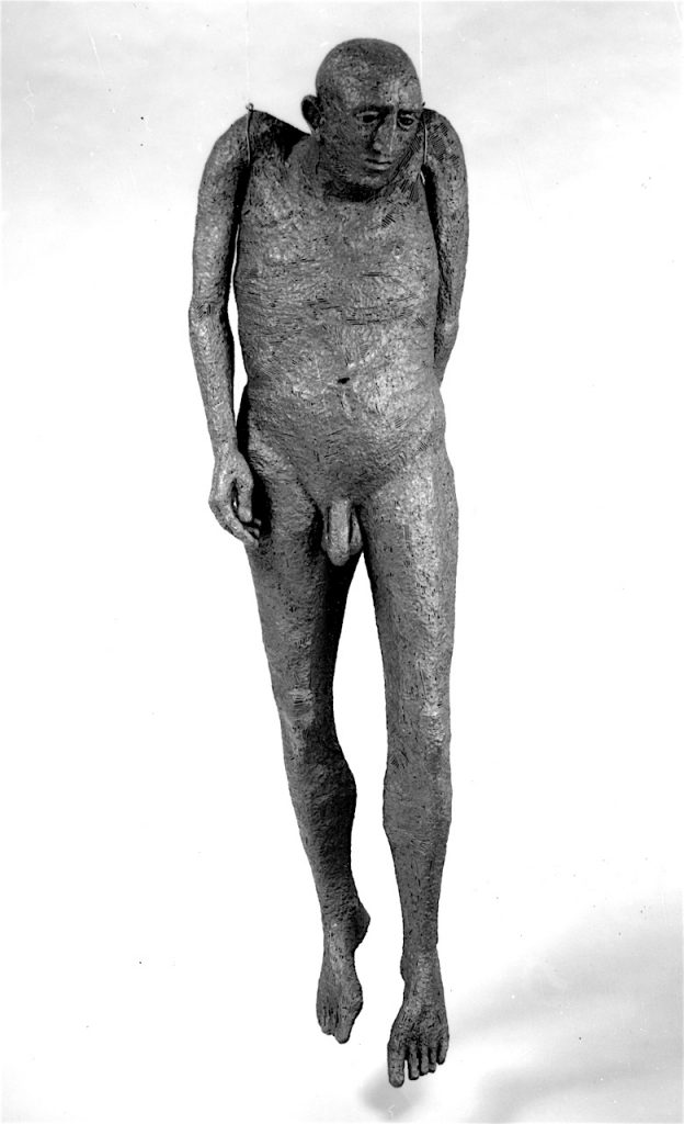 Contemporary events have inspired the artist to create some of his best works. The Vietnamese War, for instance, supplied the creative spark for the sculpture of the “Legless Man”. Yet Wallace’s art rarely aims at specifics, and the agonized despair expressed by the “Legless Man” cannot be confined to a particular war. Contemporary actions become germinating points for the depiction of a spiritual drama which stretches back to the Bible and beyond. Modern day prisoner portrayals bear an affinity to representations of Lazarus and the dead Christ, beneficiaries of systems of justice are poised in balancing acts comparable to the artist’s arrangement of Adam and Eve in “The Apple Pickers”. Through this process of artistic comparisons, Wallace pulls our particular actions into the timeless arena of unresolved psychological and spiritual situations. We begin to see the accelerating episodes of brutality and suffering in our world, of which we are a part, as the manifestations of an ever growing spiritual crisis.