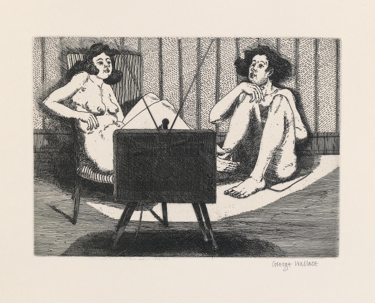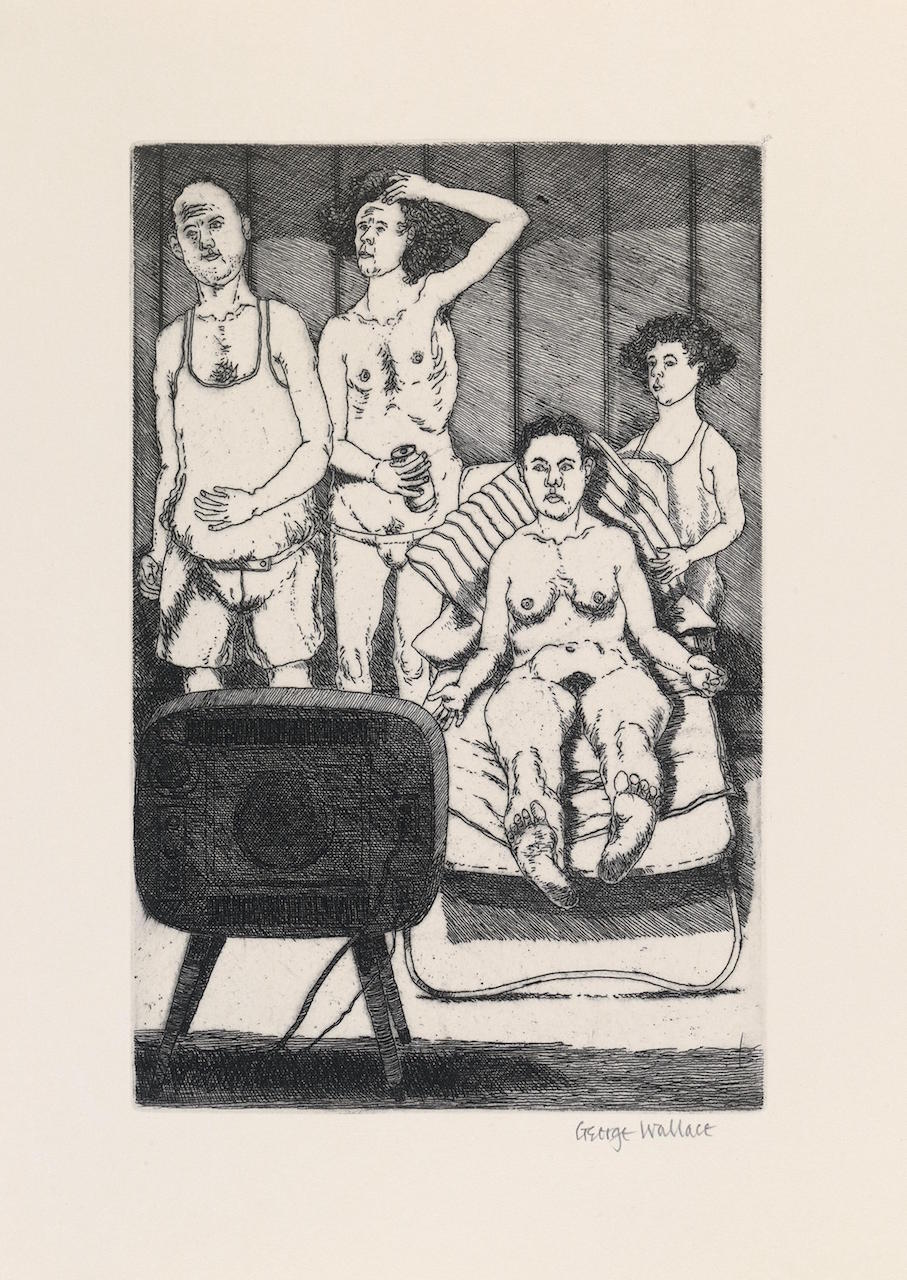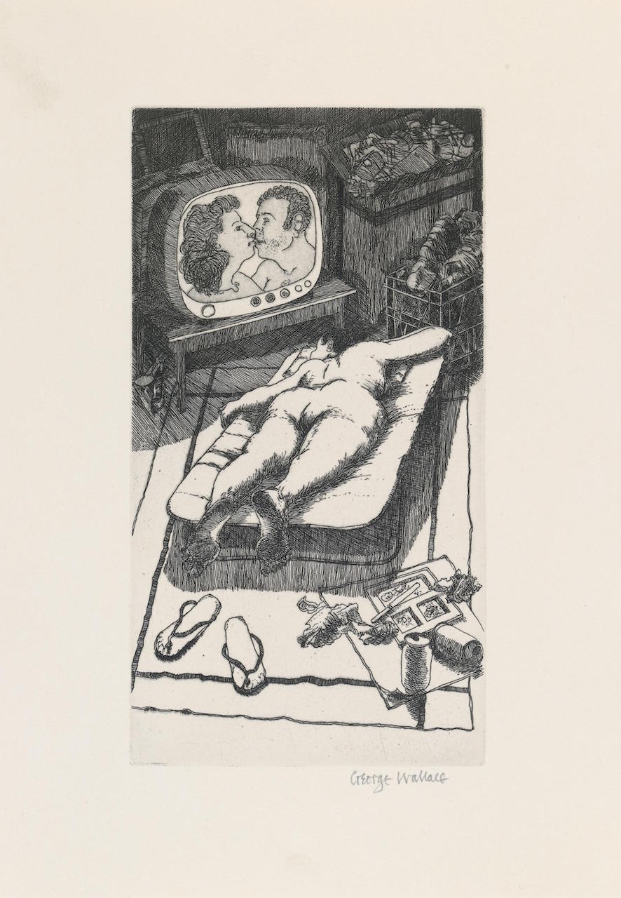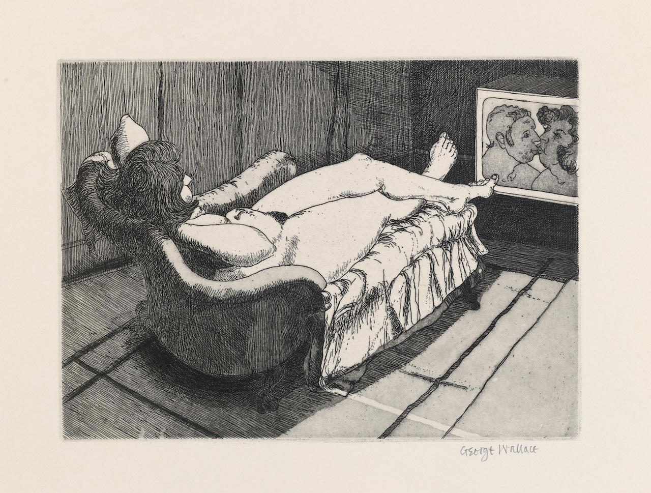 In 1995 Wallace created a portfolio of twelve etchings dedicated to our fascination with the TV soap opera. This work is satirical, reflecting a particular obsession in contemporary culture. The large numbers of naked figures in the prints is perhaps an excuse to re-purpose some of his early life drawings as a student. The image of the woman reclining on the chaise longue is certainly taken from a lithograph he made in 1954. Reading the titles of the prints you will also notice that this is a book of hours — perhaps a veiled nod to early illuminated devotional books.