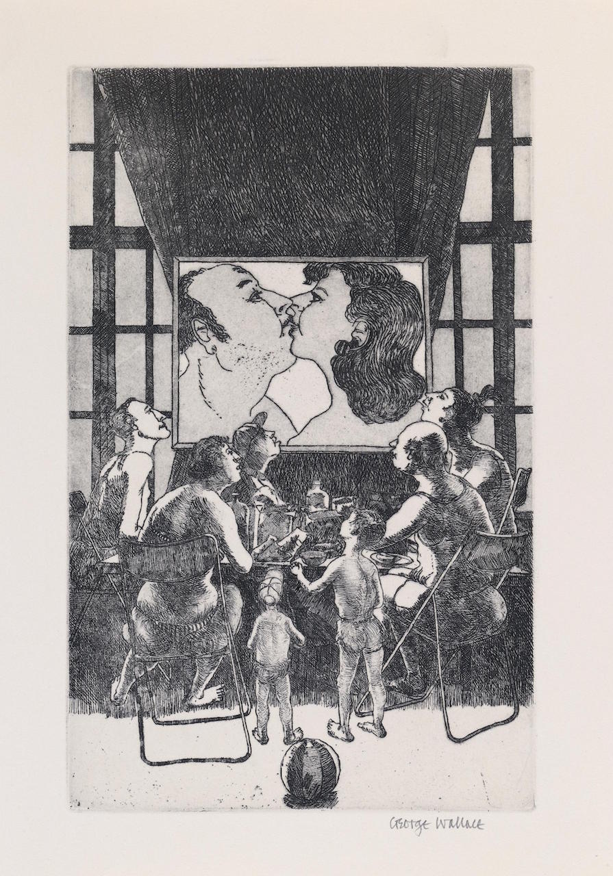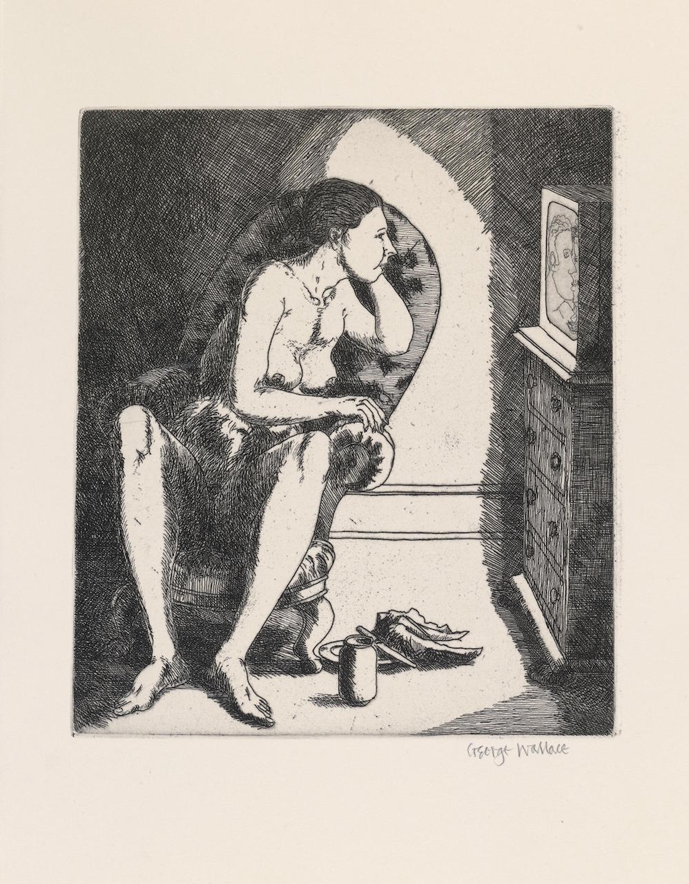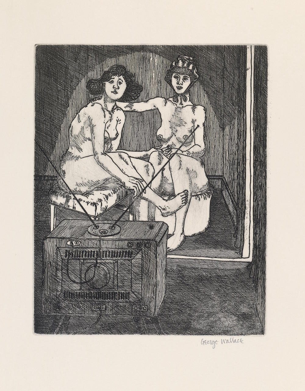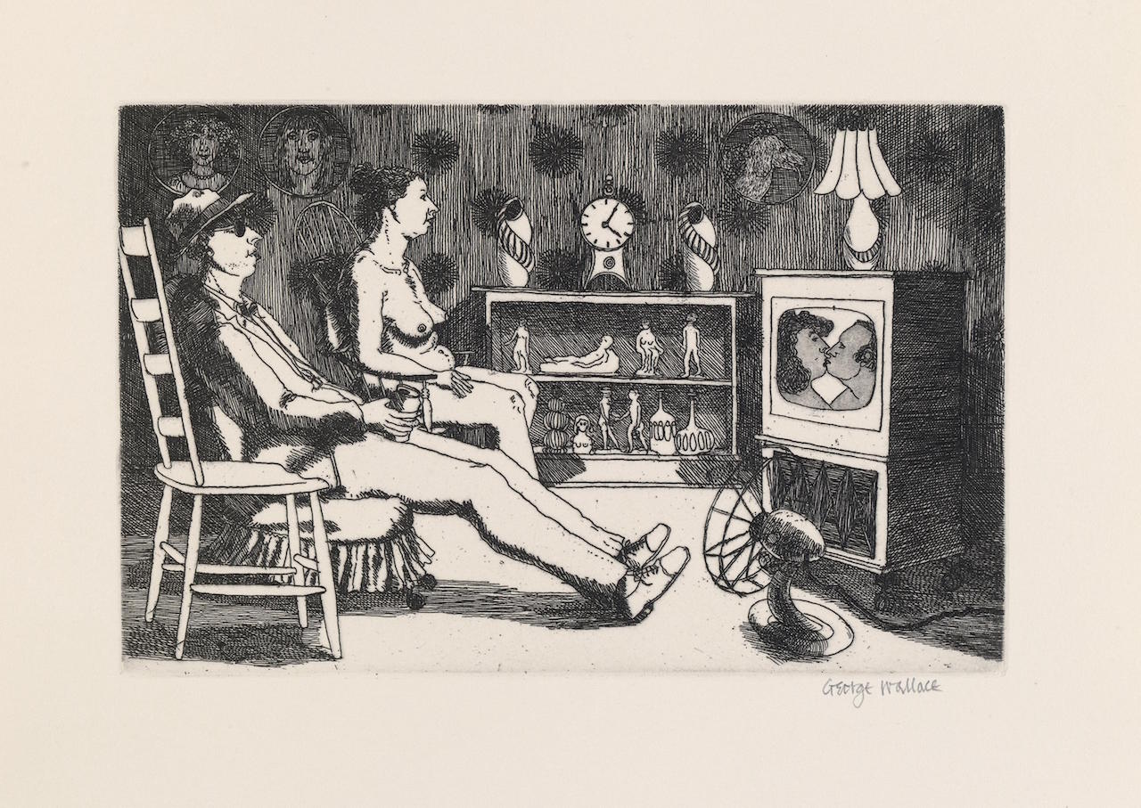 In 1995 Wallace created a portfolio of twelve etchings dedicated to our fascination with the TV soap opera. This work is satirical, reflecting a particular obsession in contemporary culture. The large numbers of naked figures in the prints is perhaps an excuse to re-purpose some of his early life drawings as a student. The image of the woman reclining on the chaise longue is certainly taken from a lithograph he made in 1954. Reading the titles of the prints you will also notice that this is a book of hours — perhaps a veiled nod to early illuminated devotional books.