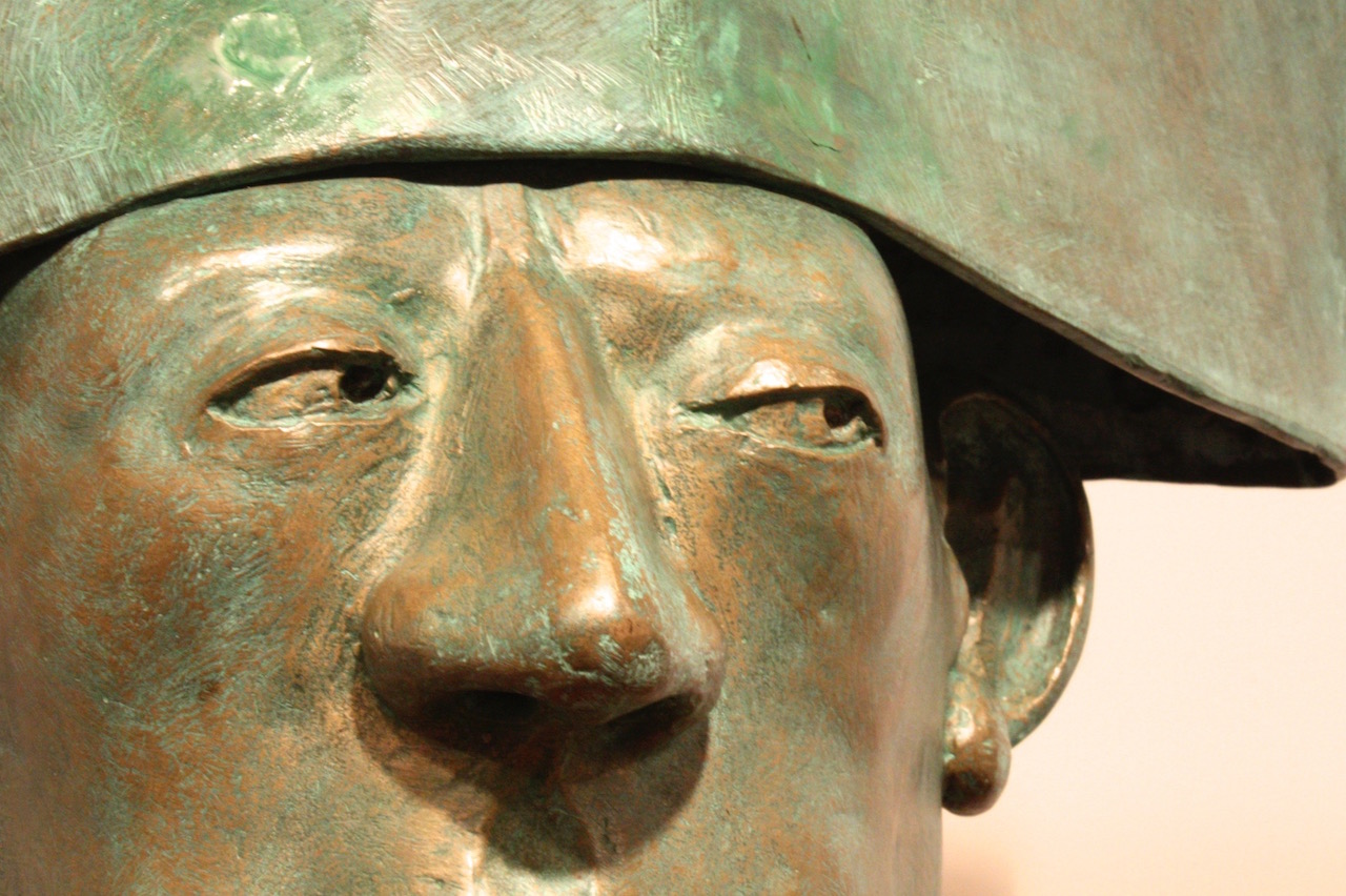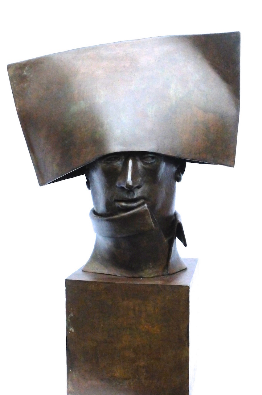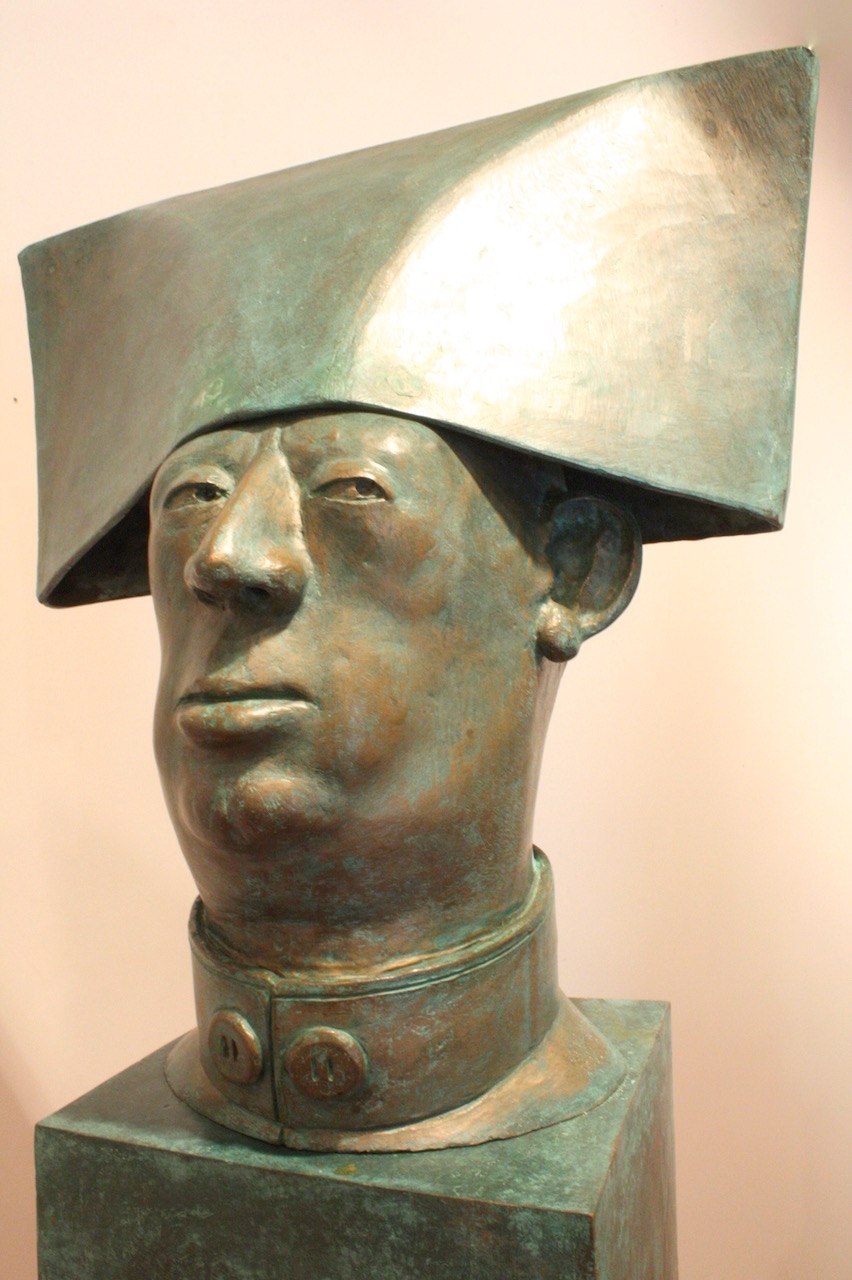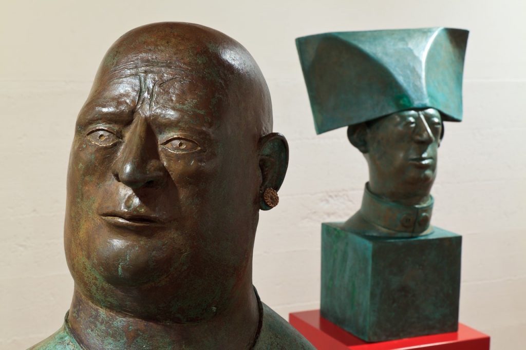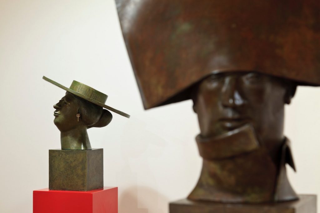 The bronze heads in “Ten Characters from a Spanish Comedy” reference the Commedia dell’arte of the 16th century Catholic Europe. Humour and the use of head dress to identify stock characters, allowed the theatre of political commentary to go unscathed in a time of repressive regimes. Outsize hats would continue to identify villains and bald pates buffoons in the theatre of the absurd and in political cartoons well into the 19th century. In Commedia dell’arte women’s roles were played by women for the first time.