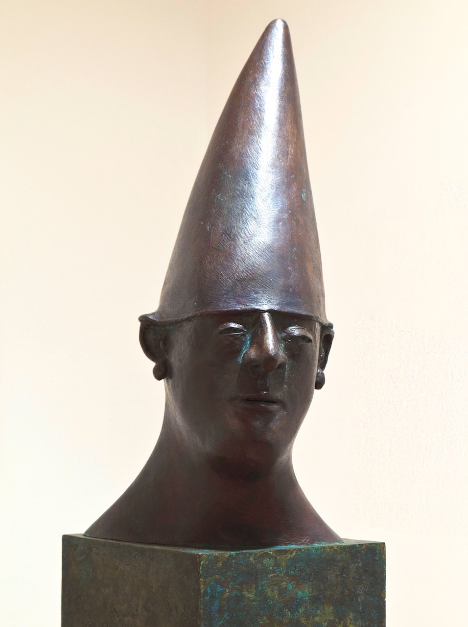 With wit and shrewd knowledge of human nature, George Wallace applied the ideas of the Commedia dell’arte to character studies of our late 20th century selves. He began the work in 1986 at a time of economic expansion and of visual and verbal bombast. They are the observations of an erudite and funny man, who viewed the world with a wry scrutiny. The carefully chosen accessories comment on the facades he observed. Each head was placed on a red pedestal, with no instructions as to how they are to be mounted. He regarded them as game pieces to be moved and manipulated. The artist expected the humorous possibilities for visual comment on human folly and relationships to be explored and continue on with each new exhibit of the work.