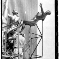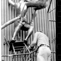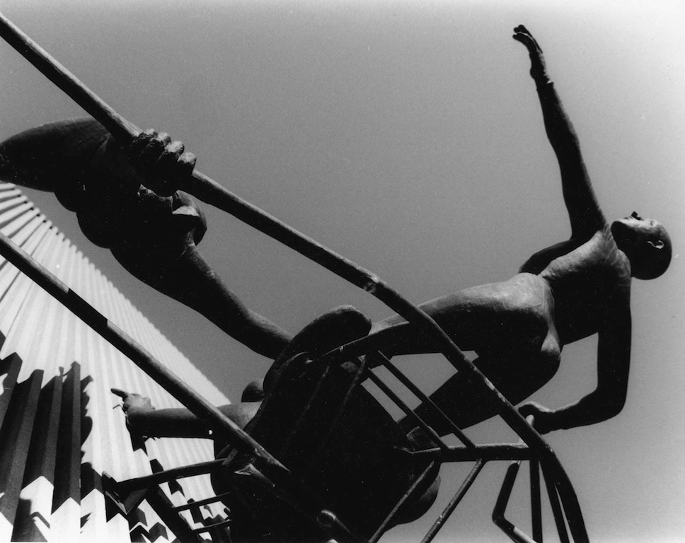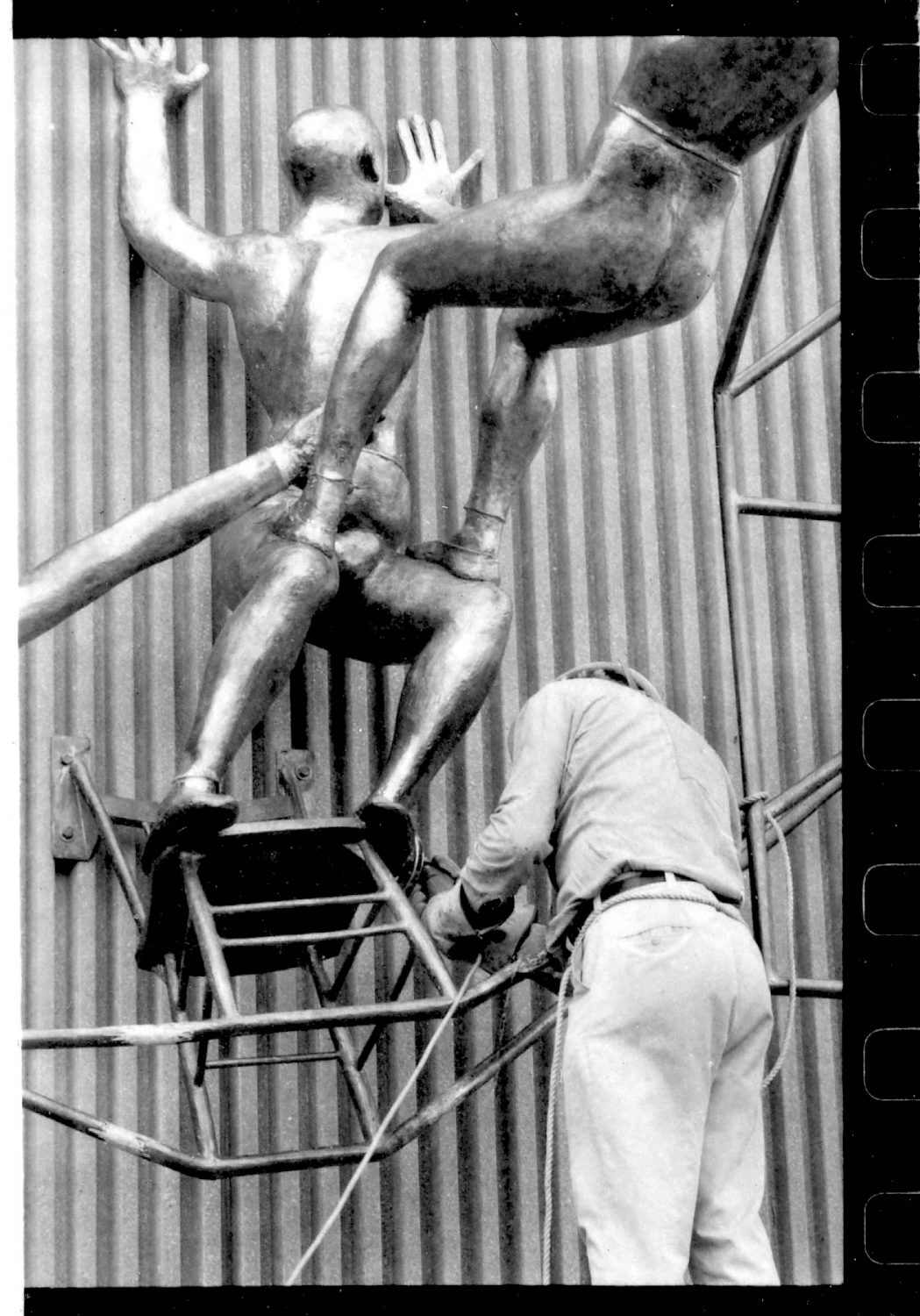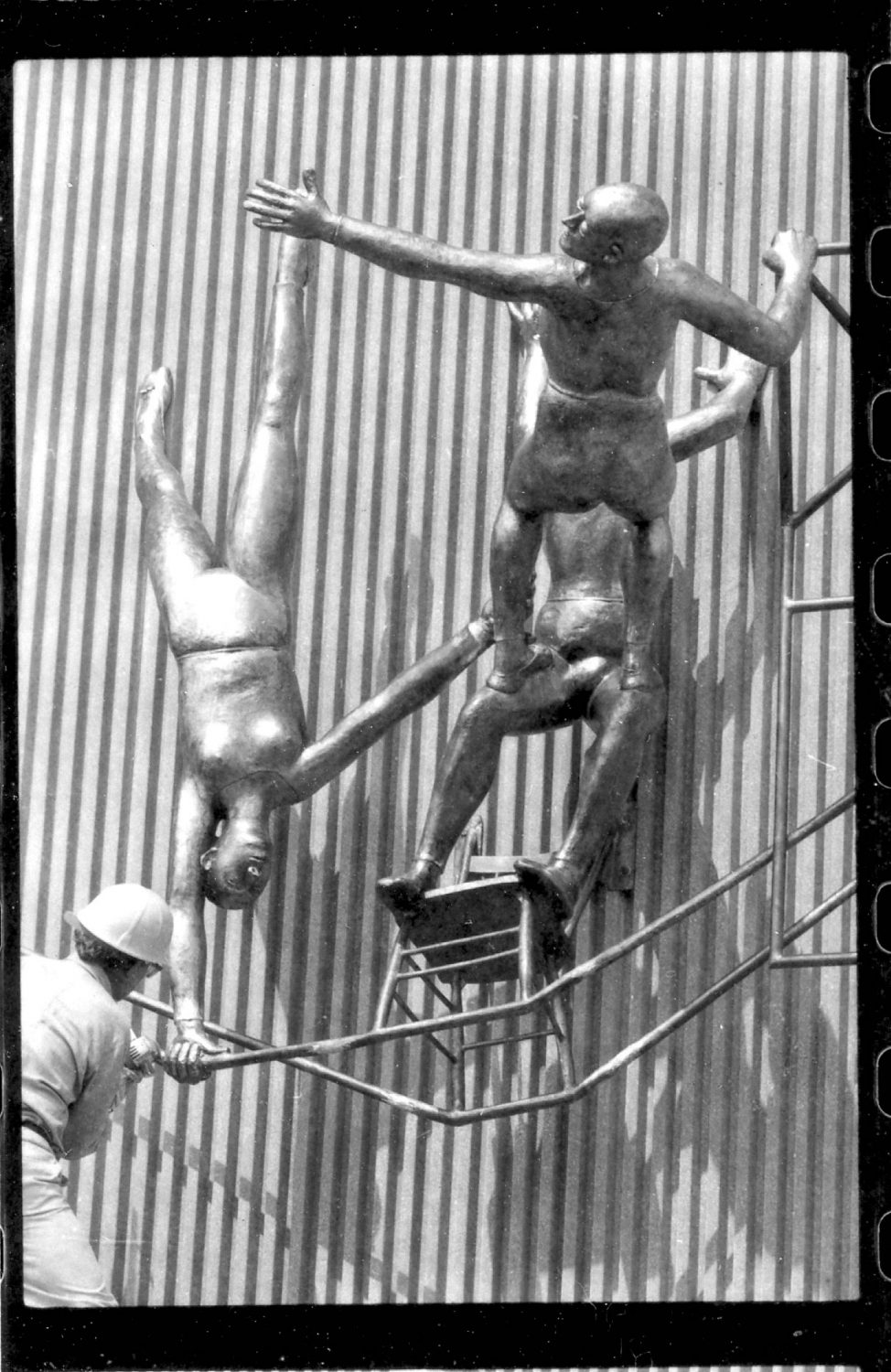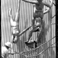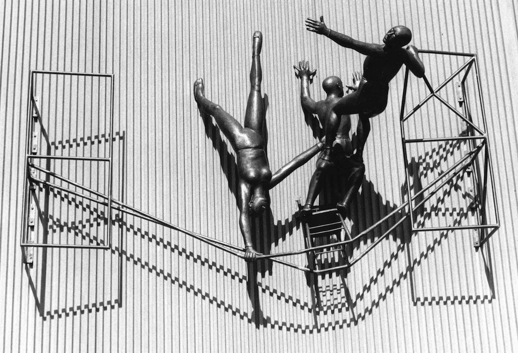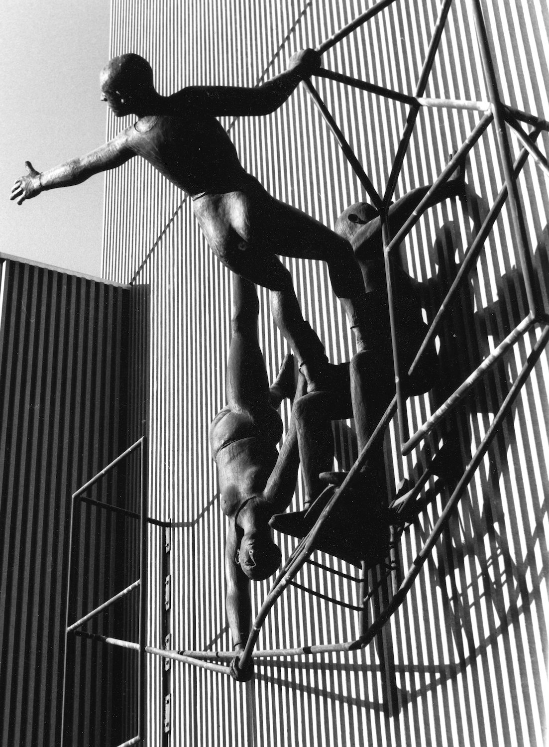 In 1980, George Wallace was commissioned to make a bronze sculpture for the new family law court in Milton, Ontario. “The Balancing Act” provides an interesting comment on justice for anyone who approaches the building. The artist relates that “The Balancing Act” was made “when we learnt the R.C.M.P. had been misbehaving itself, and generally illustrates that justice is a risky business”. Here, the scales of justice symbol has been transformed into a dizzying balance on tightropes, where a mother, father and son are forced to assume extreme and dangerous positions in order to counter one another’s movements. Only a constant, frantic struggle maintains the equilibrium.