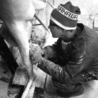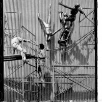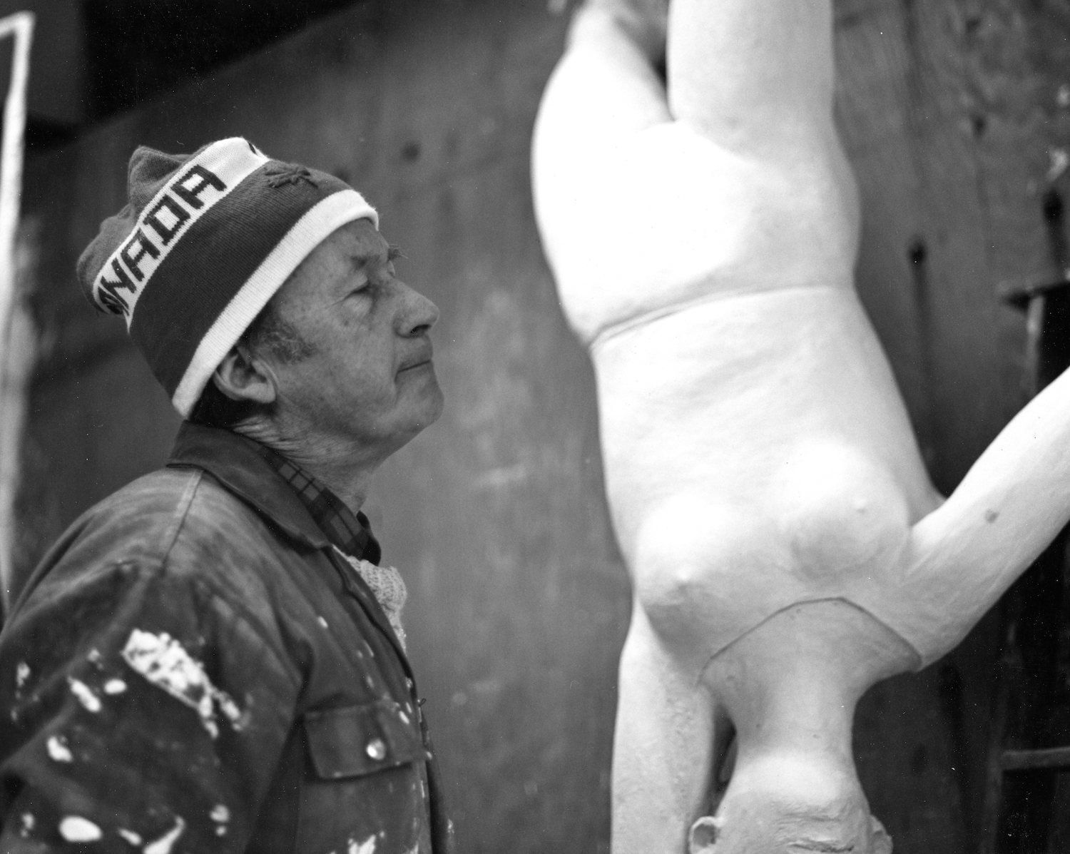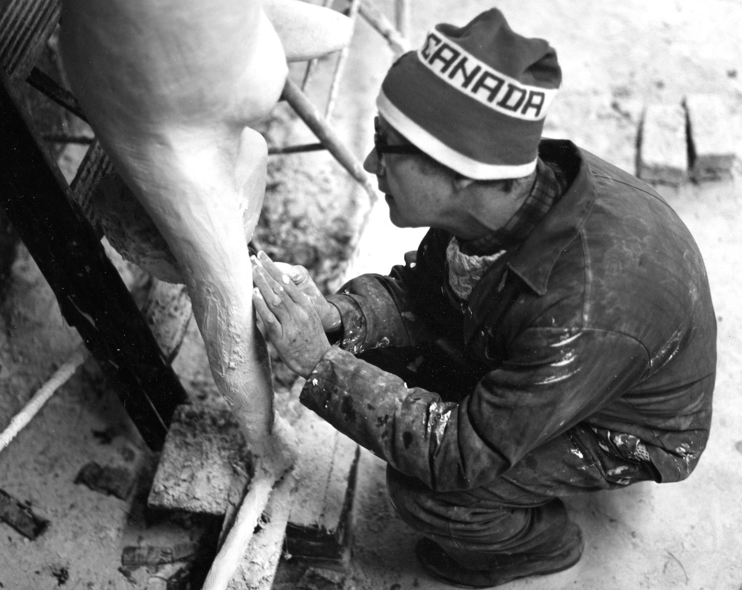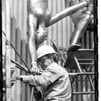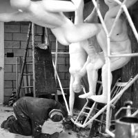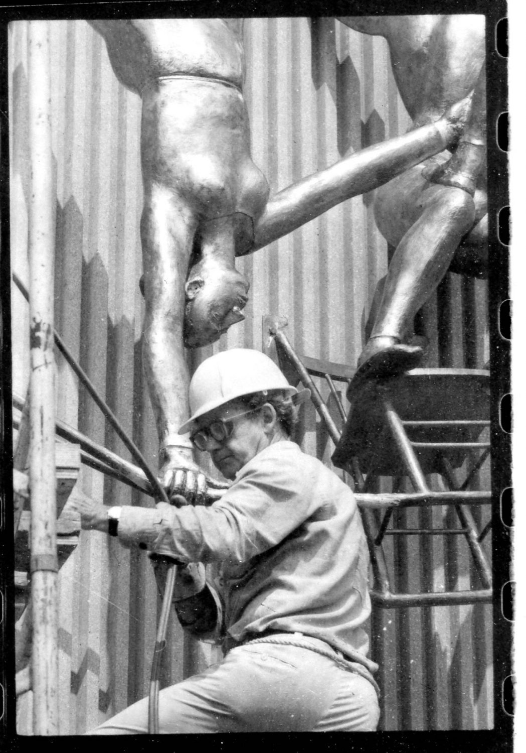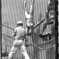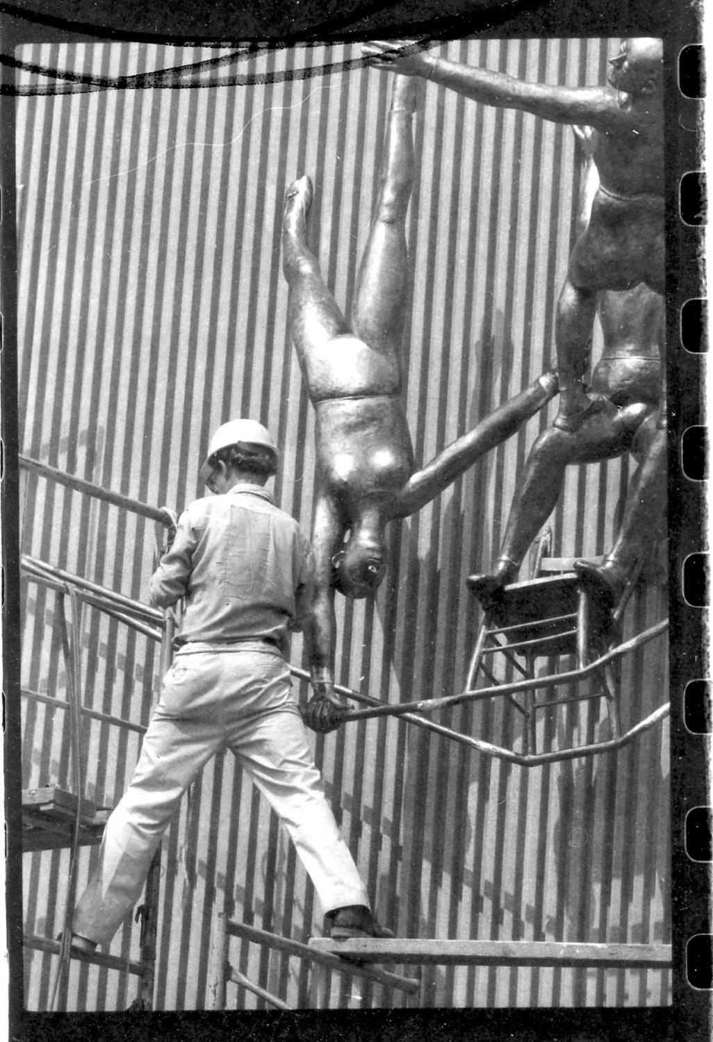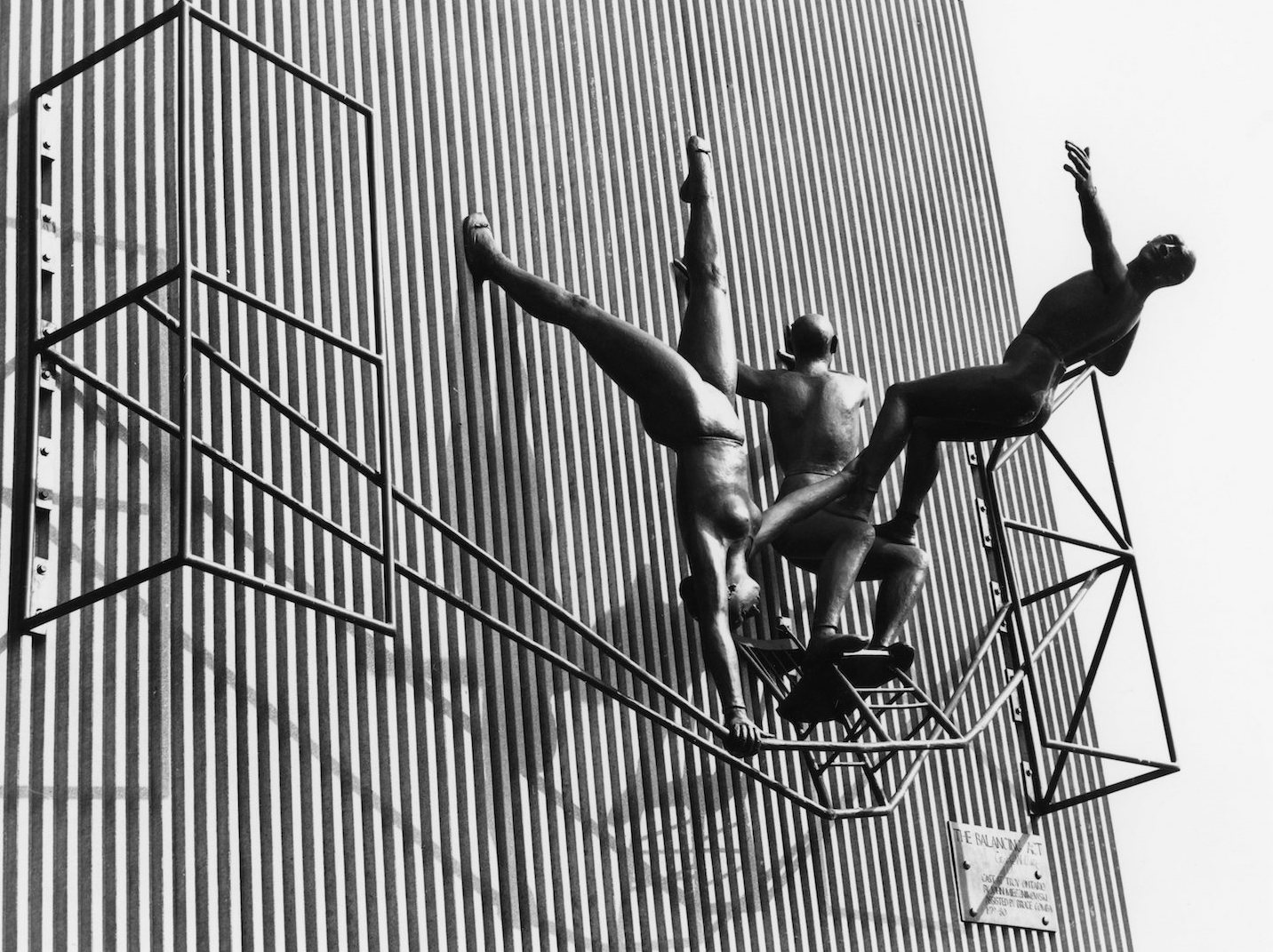 In 1980, George Wallace was commissioned to make a bronze sculpture for the new family law court in Milton, Ontario. “The Balancing Act” provides an interesting comment on justice for anyone who approaches the building. The artist relates that “The Balancing Act” was made “when we learnt the R.C.M.P. had been misbehaving itself, and generally illustrates that justice is a risky business”. Here, the scales of justice symbol has been transformed into a dizzying balance on tightropes, where a mother, father and son are forced to assume extreme and dangerous positions in order to counter one another’s movements. Only a constant, frantic struggle maintains the equilibrium.