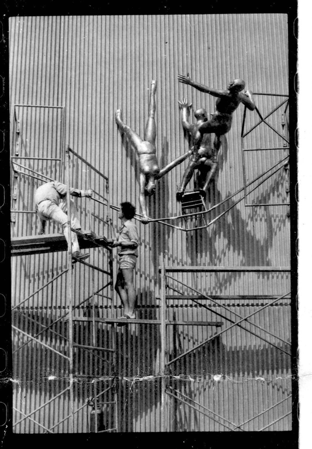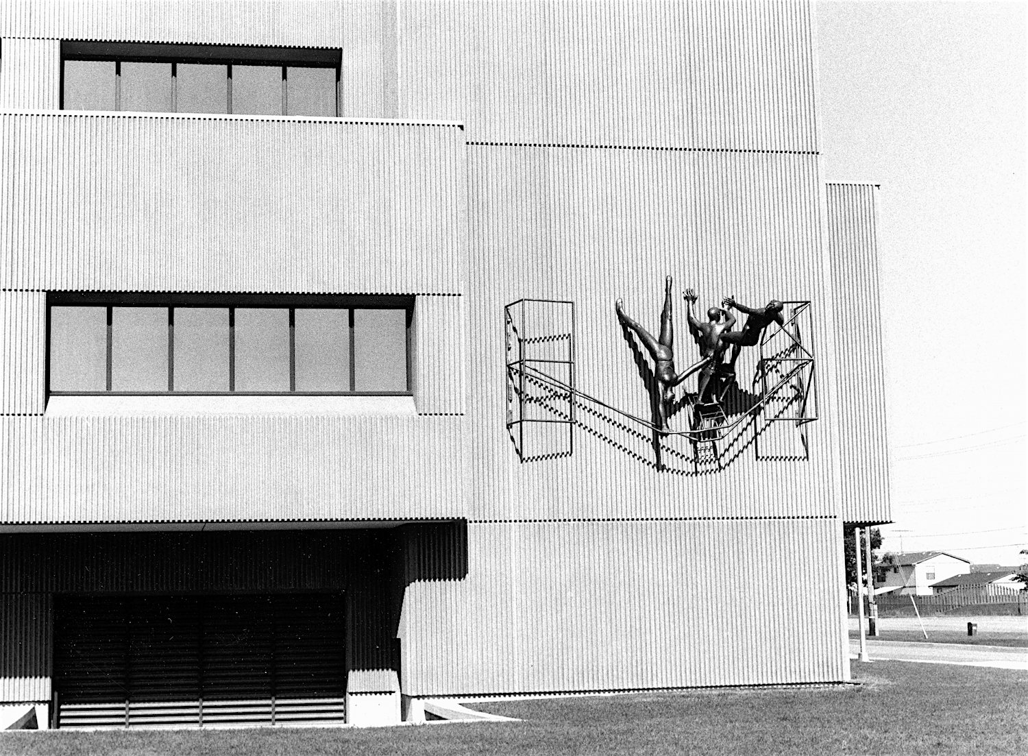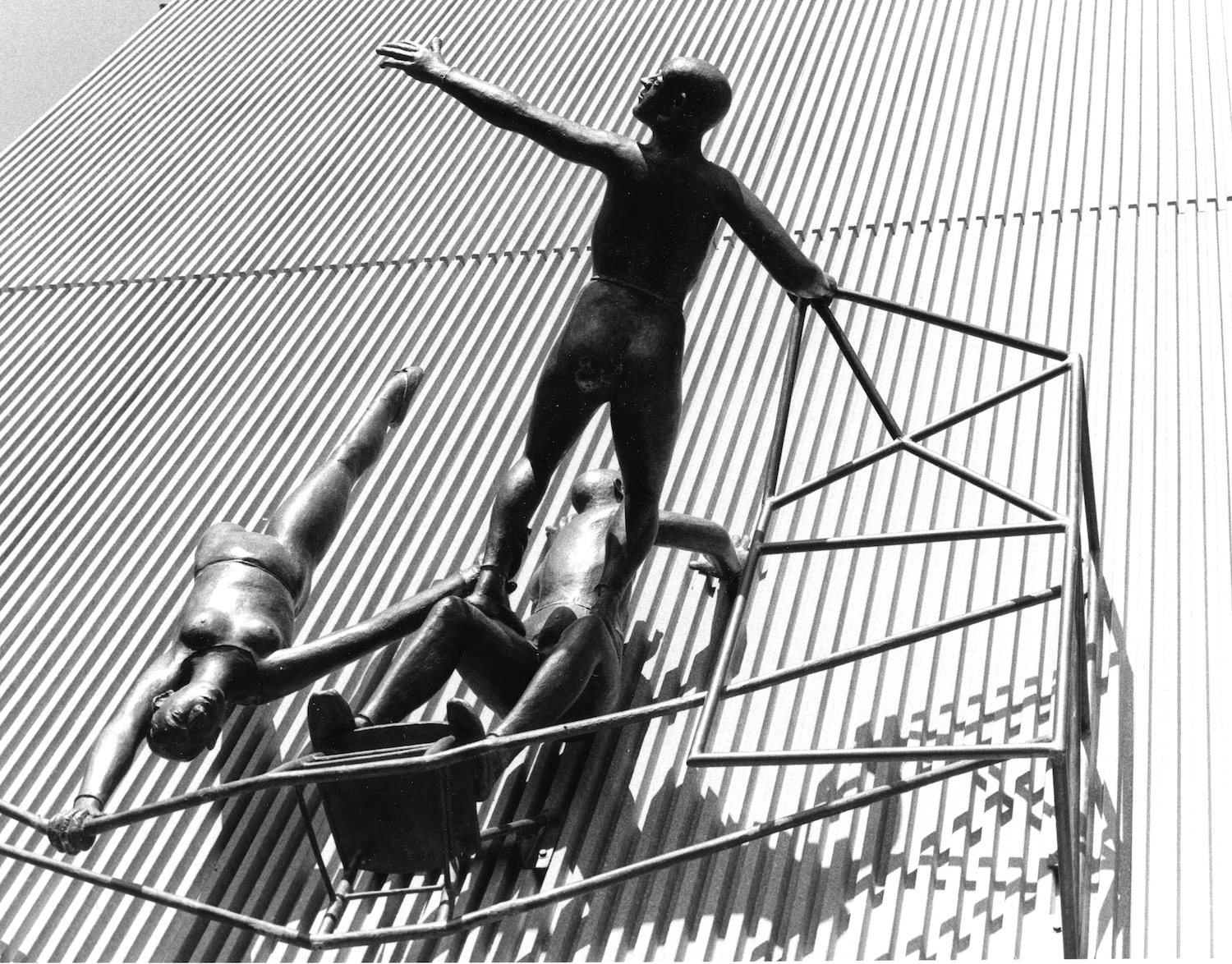 You cannot help but become aware of the discrepancy between the static, uninviting walls and the precarious movements of the three bronze figures. It is to be hoped that the institution housed behind this exterior can give essential aid to the ‘balancing act’ of this family unit.