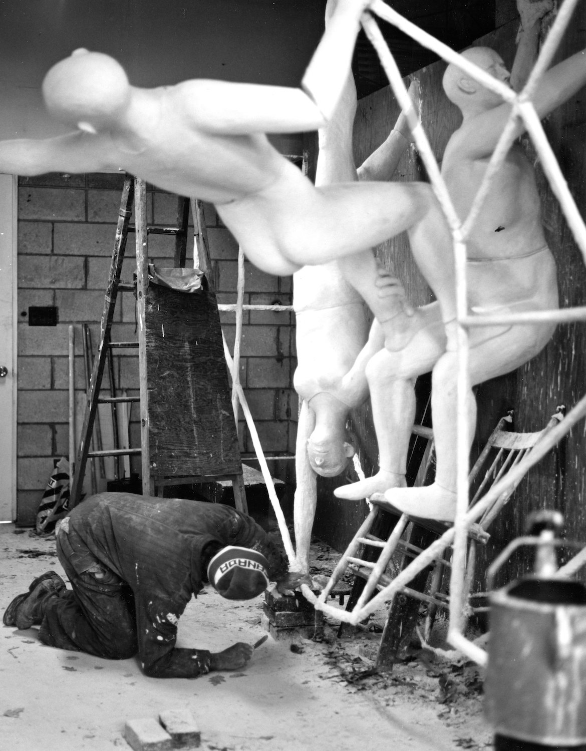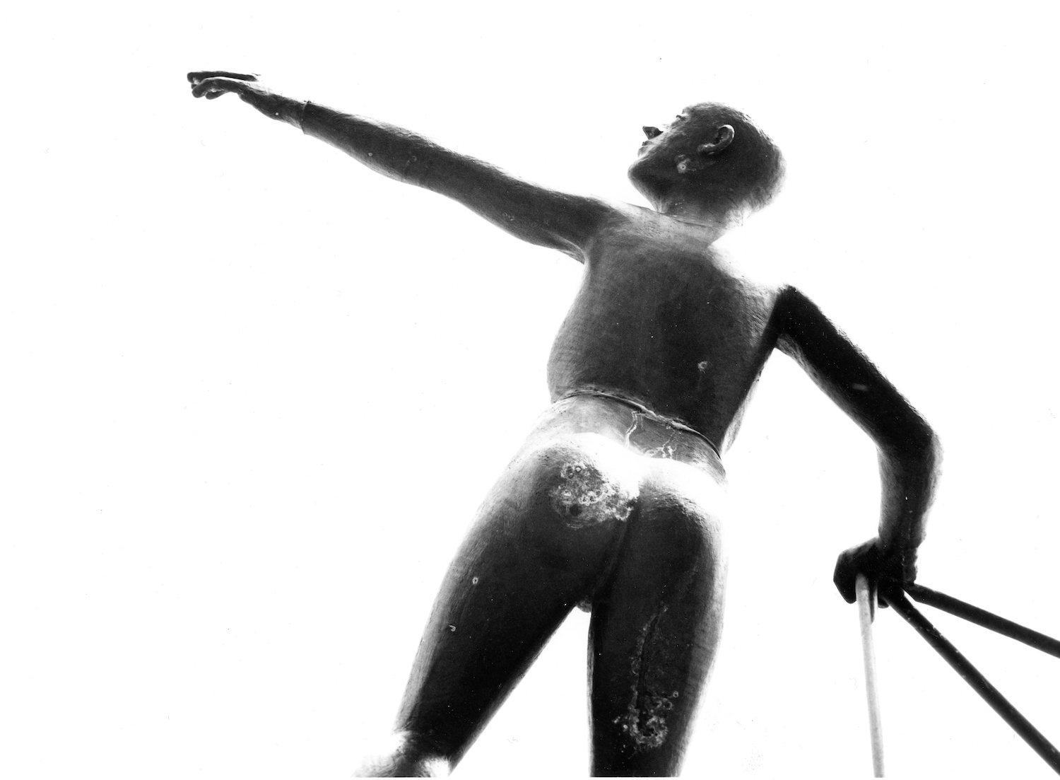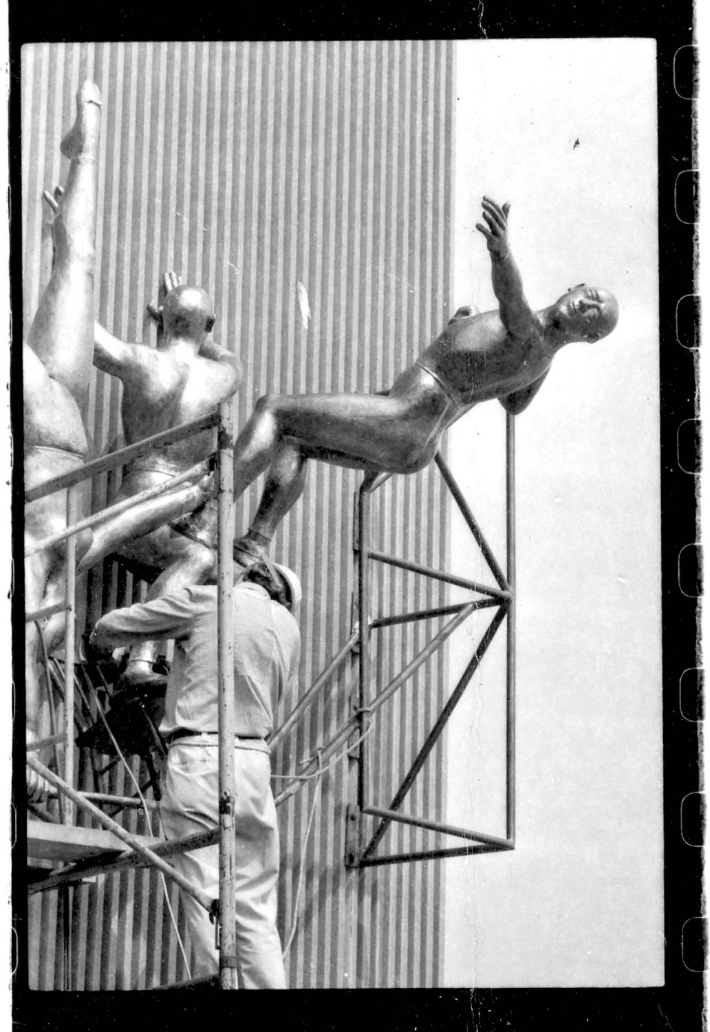 You cannot help but become aware of the discrepancy between the static, uninviting walls and the precarious movements of the three bronze figures. It is to be hoped that the institution housed behind this exterior can give essential aid to the ‘balancing act’ of this family unit.